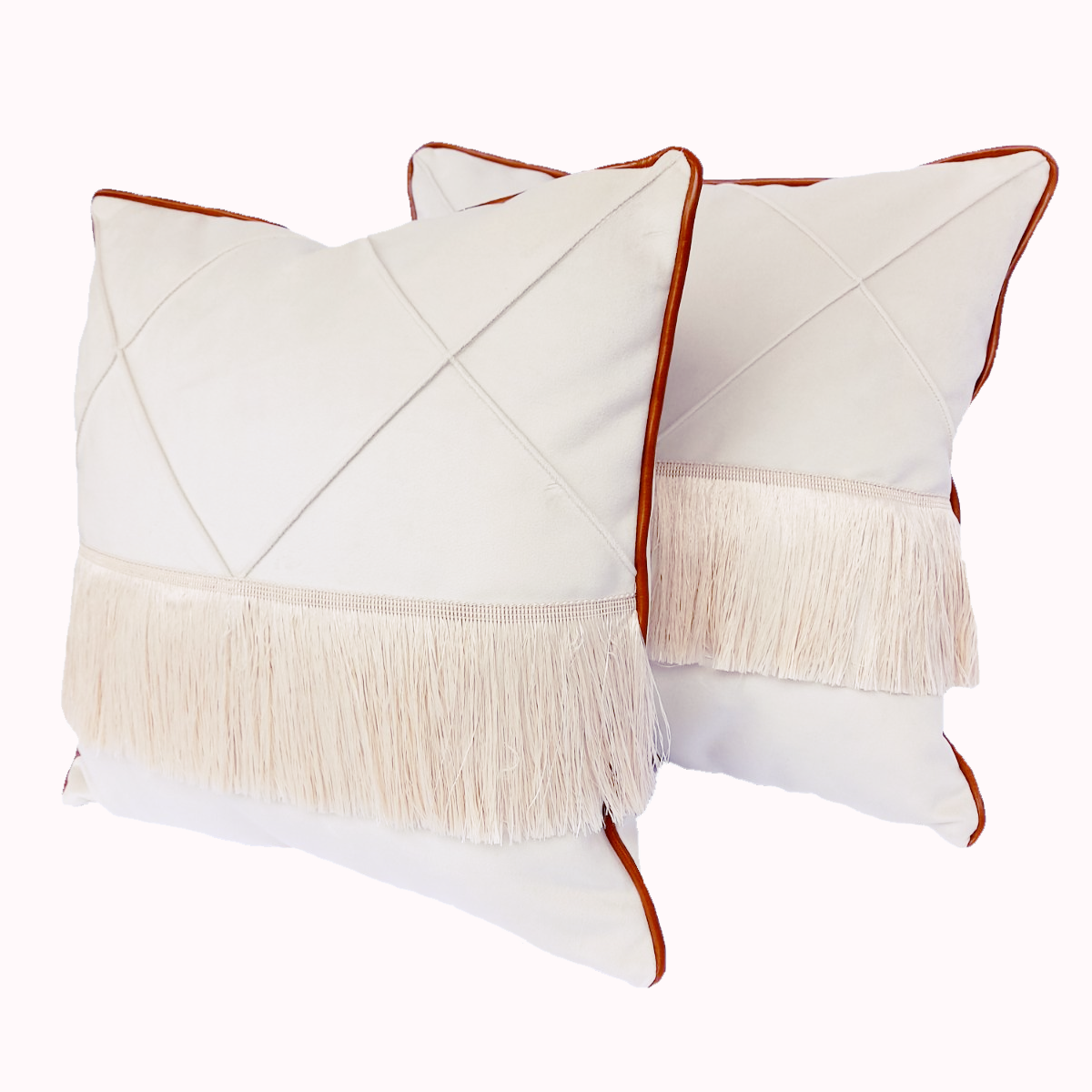 W kwadratowych z trzech stron doszyta jest brązowa wypustka (kedra) z ekoskóry i na wierzchniej stronie poszewek są frędzle w kolorze kremowym.