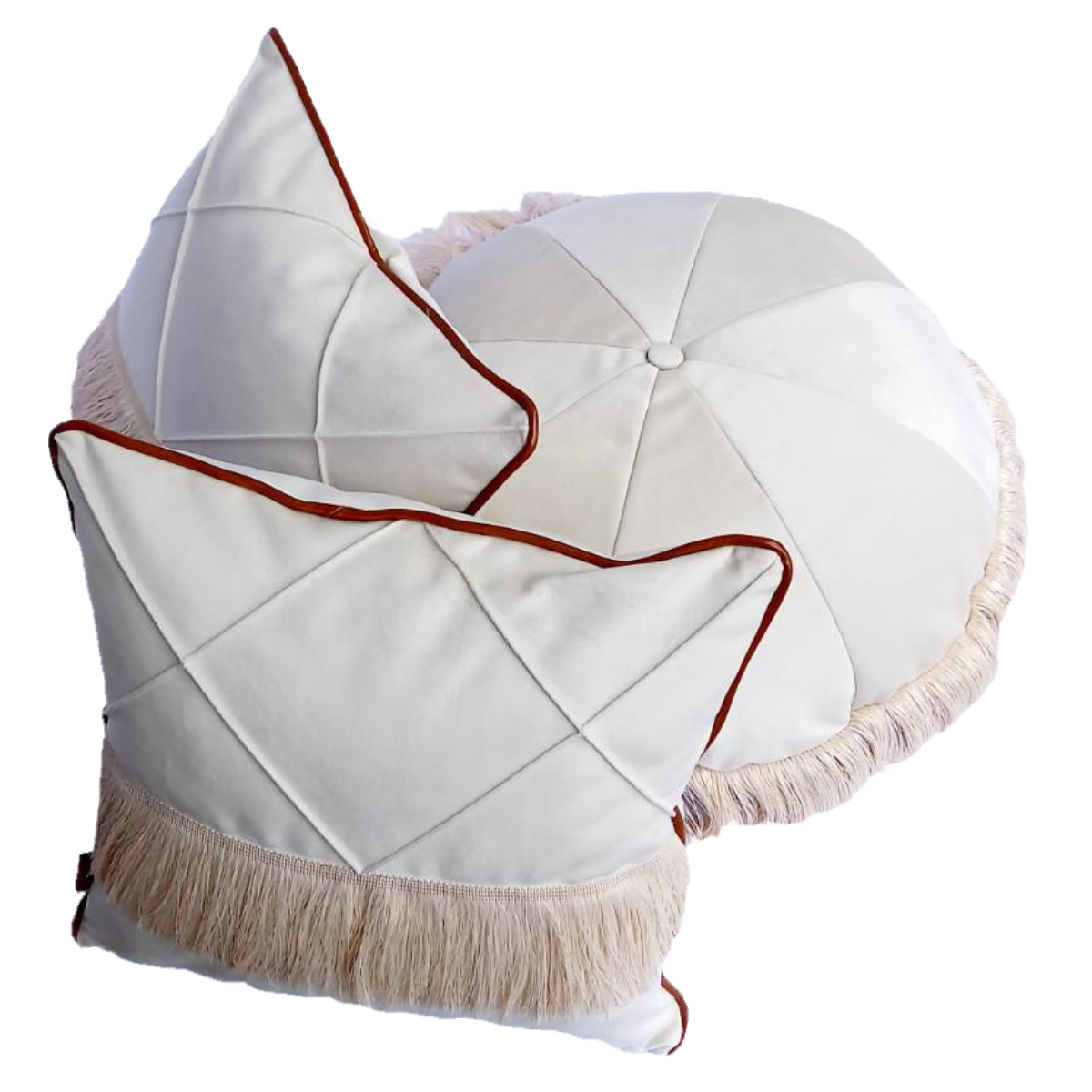 Prezentujemy zestaw trzech poduszek dekoracyjnych boho: dwóch kwadratowych z frędzlami, z brązową wypustką z ekoskóry i ozdobnymi szczypankami (wypustkami / przeszyciami) oraz jednej poduchy okrągłej meduzy z frędzlami i wodoodpornym spodem. Zestaw tych poduszek uszyliśmy z kremowego weluru.
