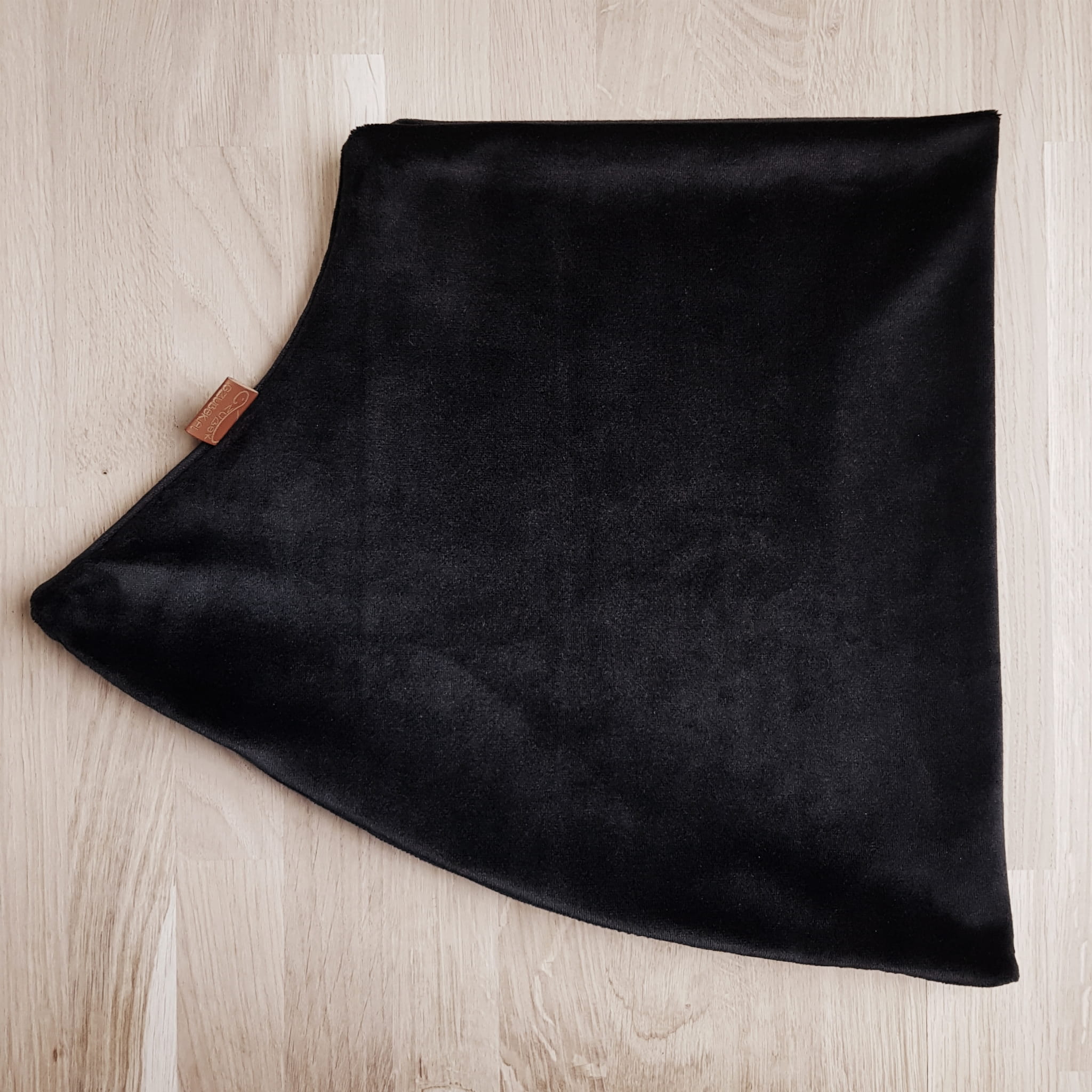 Ozdobny komin damski lub dziecięcy (do wyboru) na szyję w czarnym kolorze z miękkiego, delikatnego i bardzo przyjemnego w dotyku velvetu / weluru. Idealny dla osób szukających alternatywy dla szalików i wiązanych chust. Komin otuli i okryje naszą szyję. Zabezpieczy ją przed zimnem i podmuchami wiatru. Można go używać podczas wiosennych spacerów lub podczas jazdy na rowerze. Komin posiada kształt kielicha. U góry jego konstrukcja jest zwężona, do dołu rozszerza się, tworząc łuk.
