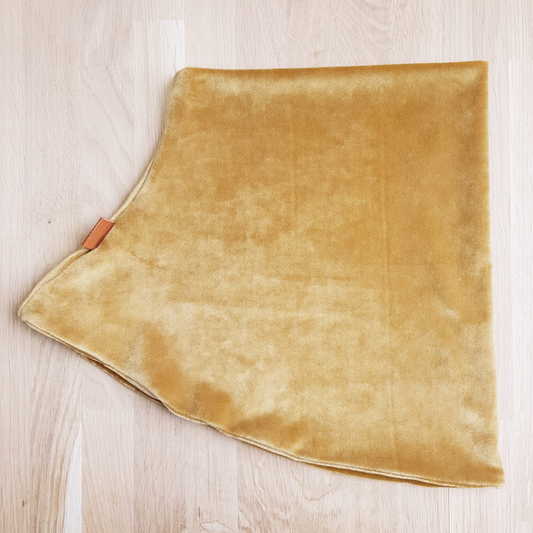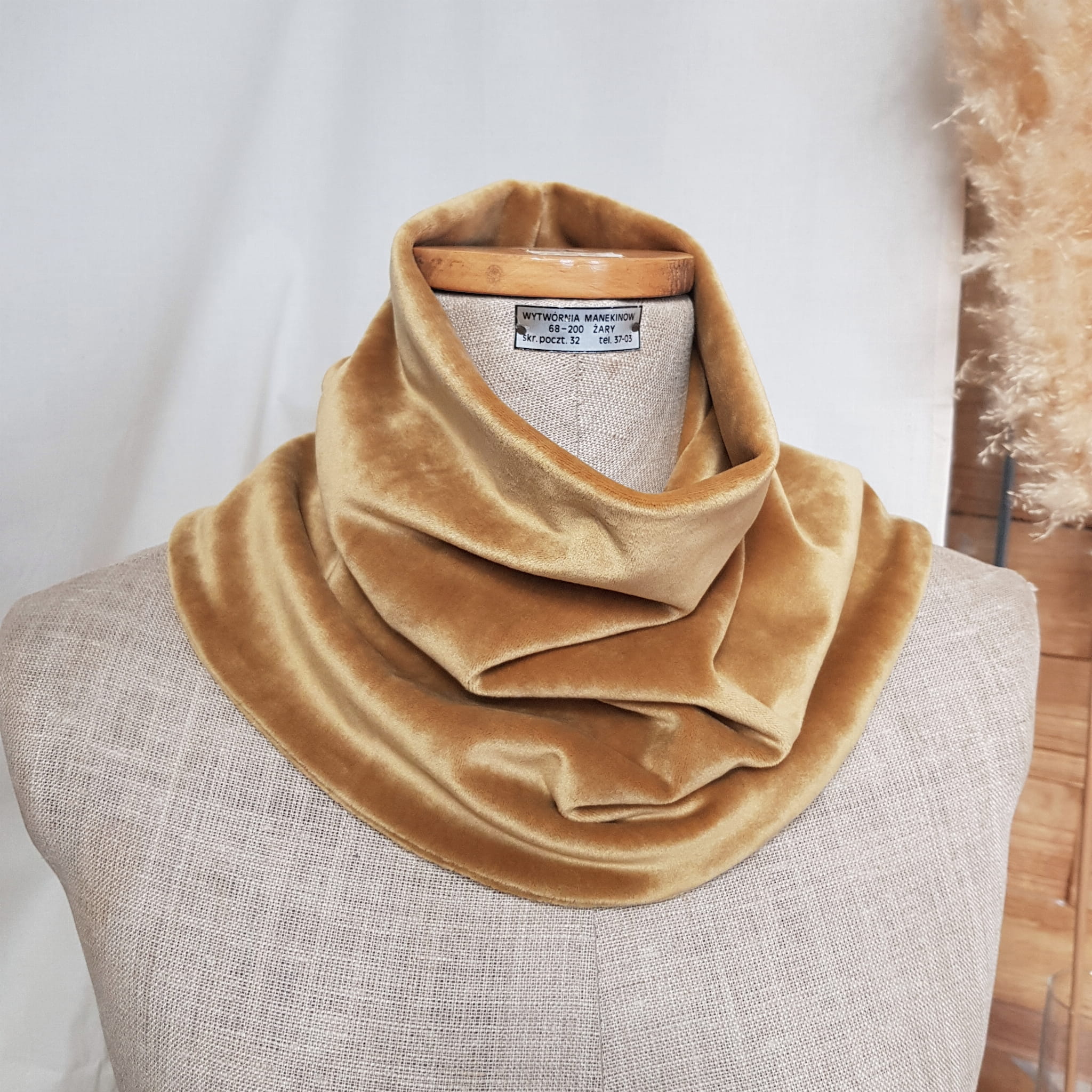 Ozdobny komin damski lub dziecięcy (do wyboru) na szyję w kolorze złotym (złoty miód) z miękkiego, delikatnego i bardzo przyjemnego w dotyku velvetu / weluru. Idealny dla osób szukających alternatywy dla szalików i wiązanych chust. Komin otuli i okryje naszą szyję. Zabezpieczy ją przed zimnem i podmuchami wiatru. Można go używać podczas wiosennych spacerów lub podczas jazdy na rowerze. Komin posiada kształt kielicha. U góry jego konstrukcja jest zwężona, do dołu rozszerza się, tworząc łuk.