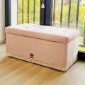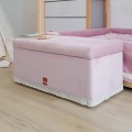 Tapicerowana ławka skrzynia pufa ze schowkiem, z doszytą ręcznie dookoła ozdobną koronką, dostępna jest w opcji na kółkach lub na drewnianych nogach. Wieko czyli siedzisko jest pikowane.