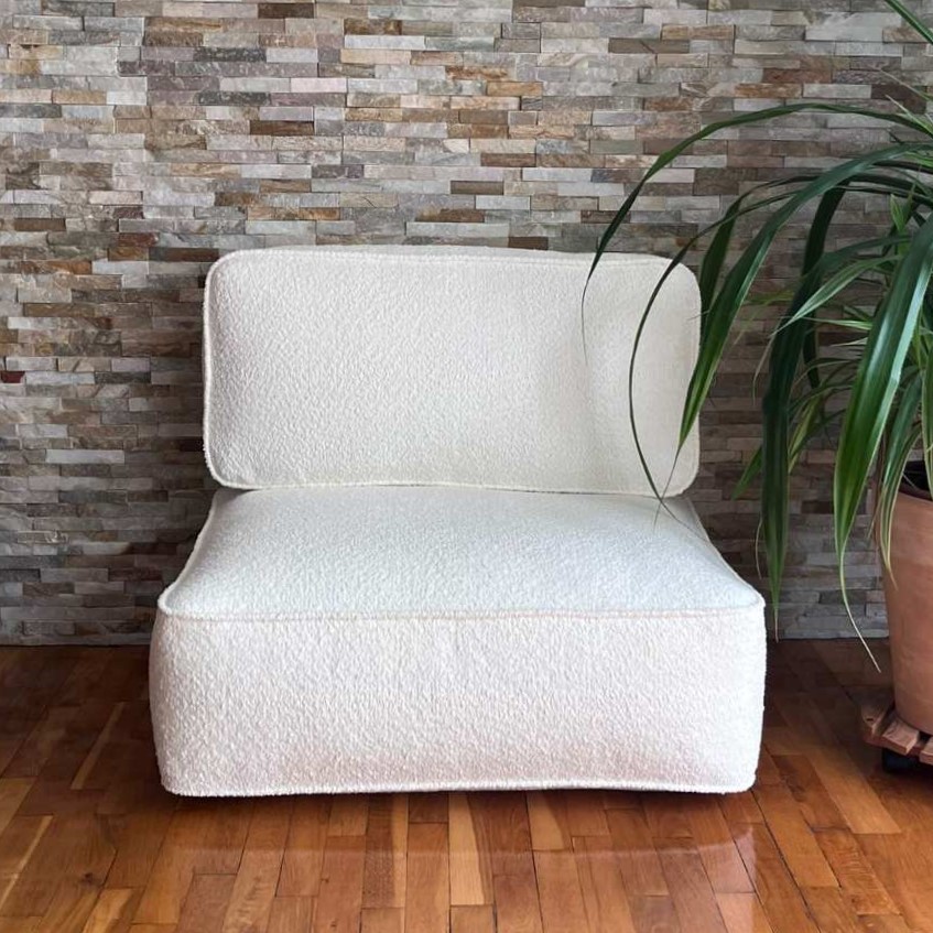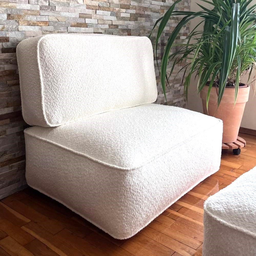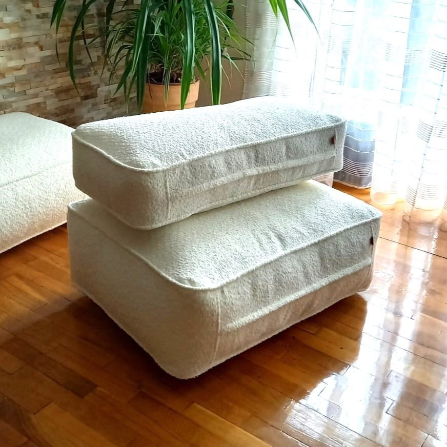 Ręcznie wykonana miękka sofa boucle składająca się z zestawu poduchy podłogowej oraz poduchy oparciowej. Kupując kilka modułów możemy własnoręcznie stworzyć kanapę lub narożnik i w ten sposób zaaranżować miejsce do siedzenia w stylu boho w salonie lub w sypialni. Poduchy możemy używać także niezależnie kładąc je obydwie na podłodze i jedną wykorzystać jako puf lub stolik a drugą jako siedzisko. Poduchy, które składają się na zestaw możemy zastosować również w modnych kanapach wykonywanych z palet. Modułowa miękka sofa kanapa fotel boucle doda przytulności każdemu wnętrzu, w którym ją zastosujemy na przykład w sypialni lub garderobie.