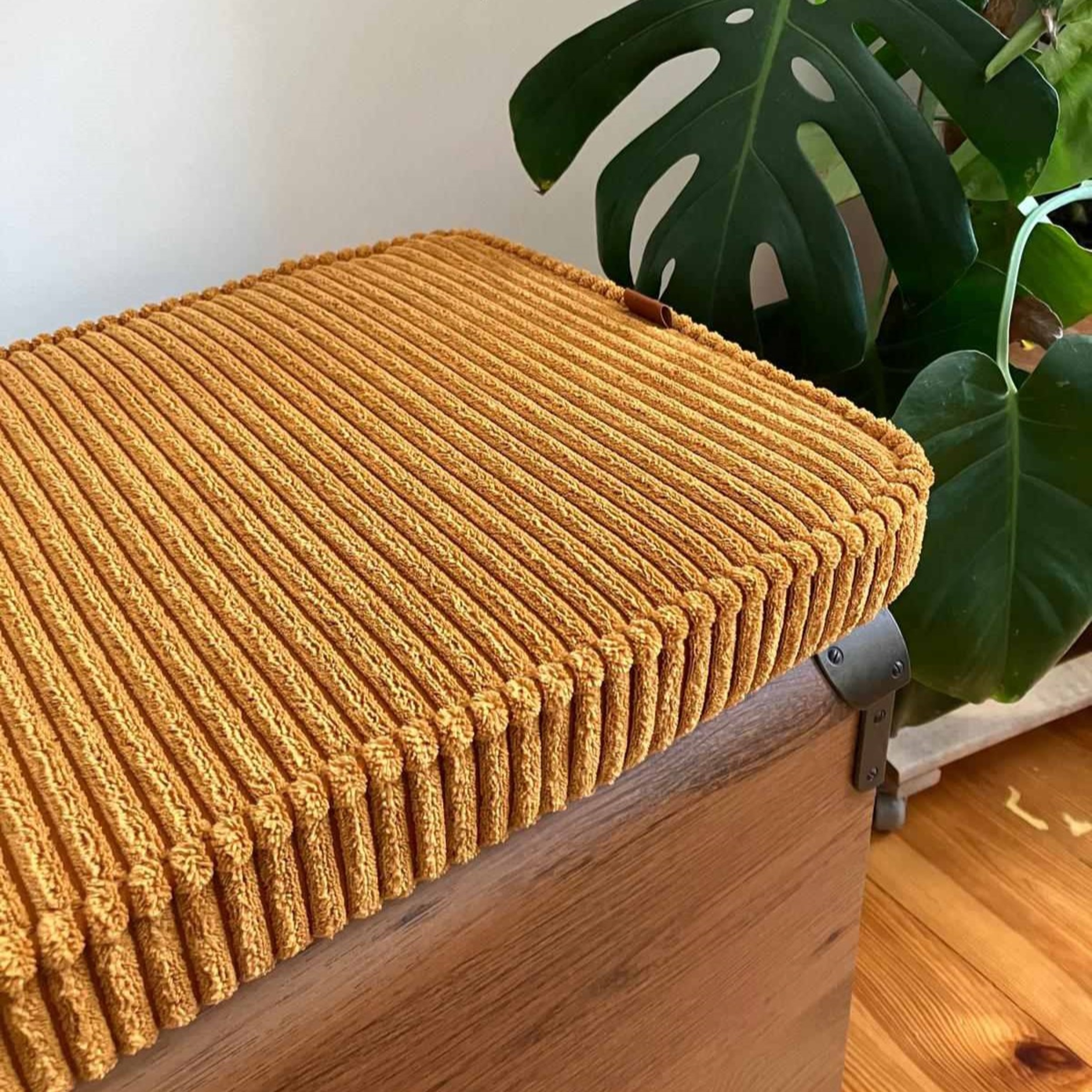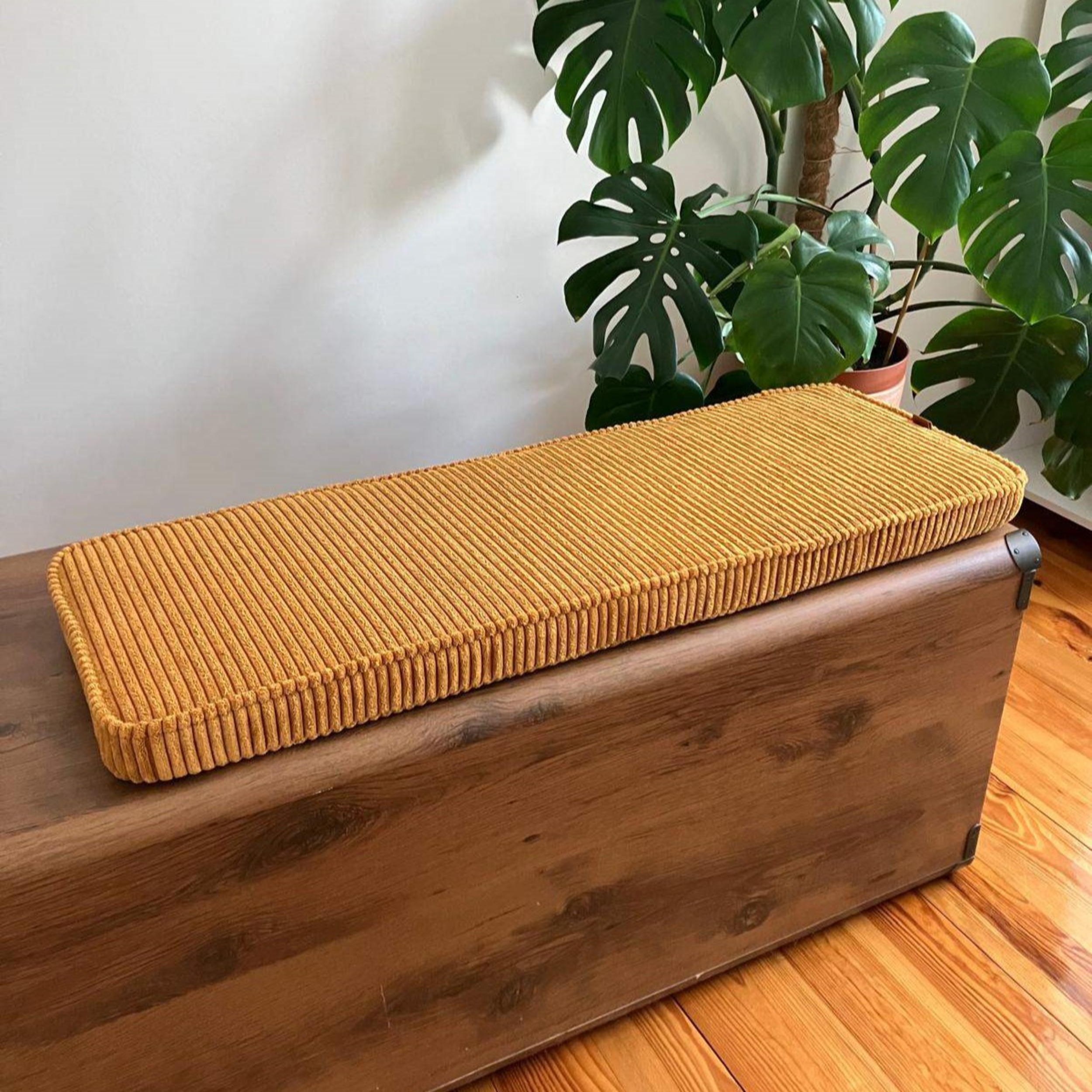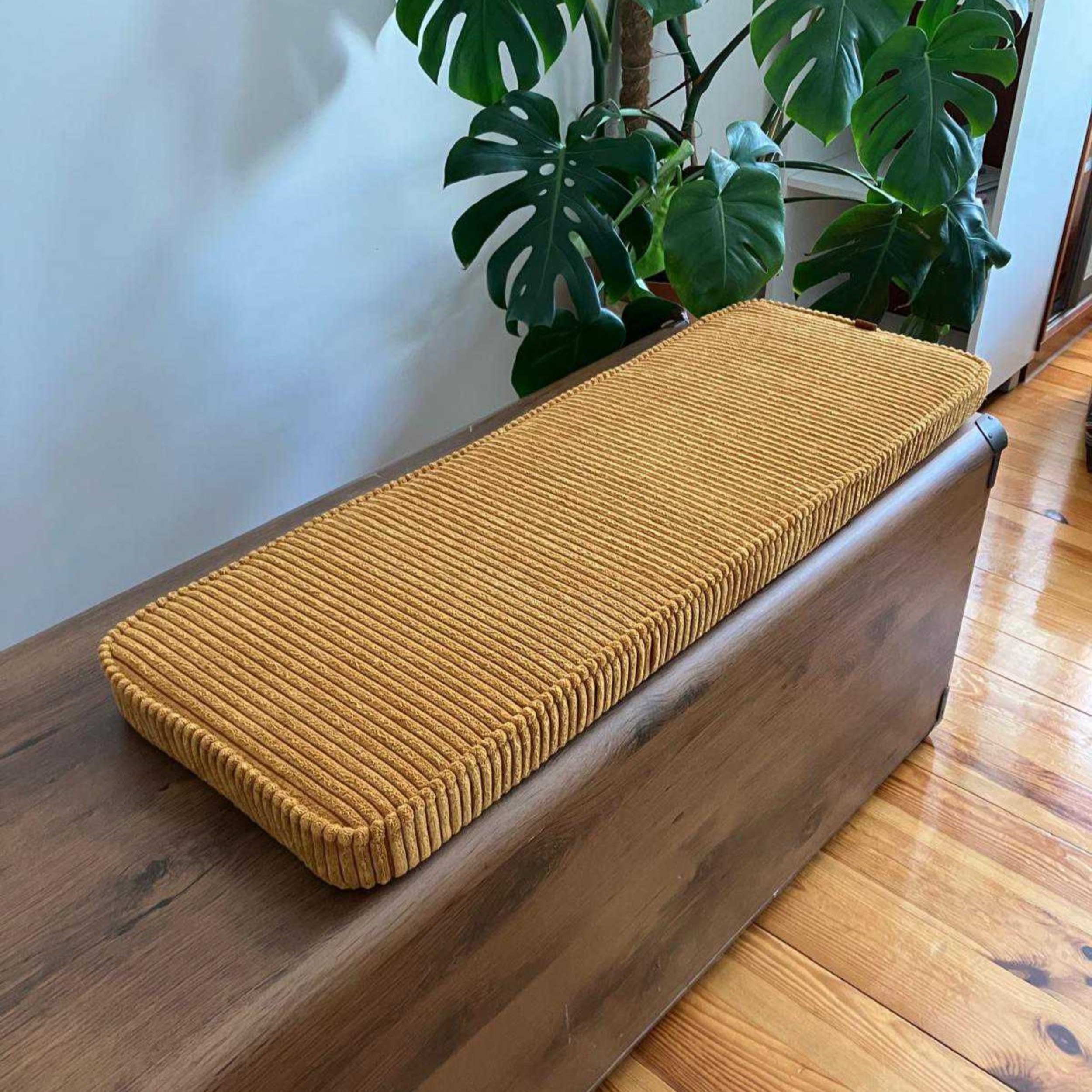 Poduszka na siedzisko z pianki tapicerskiej o grubości 5 cm oraz sztruksowego pokrowca na zamek do przedpokoju – wygoda i styl dopasowane do Twojej przestrzeni.